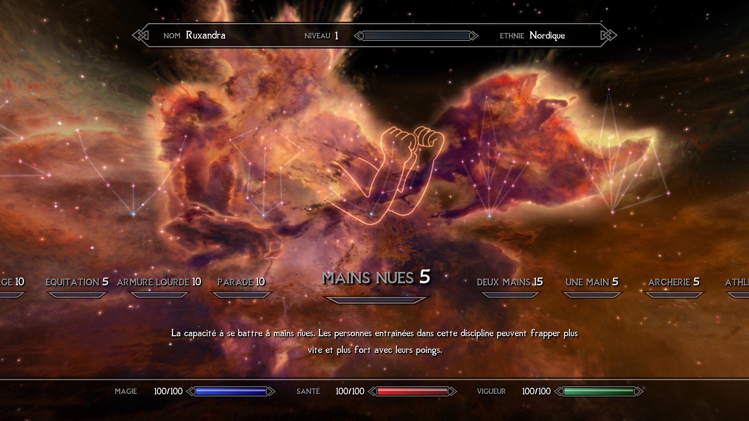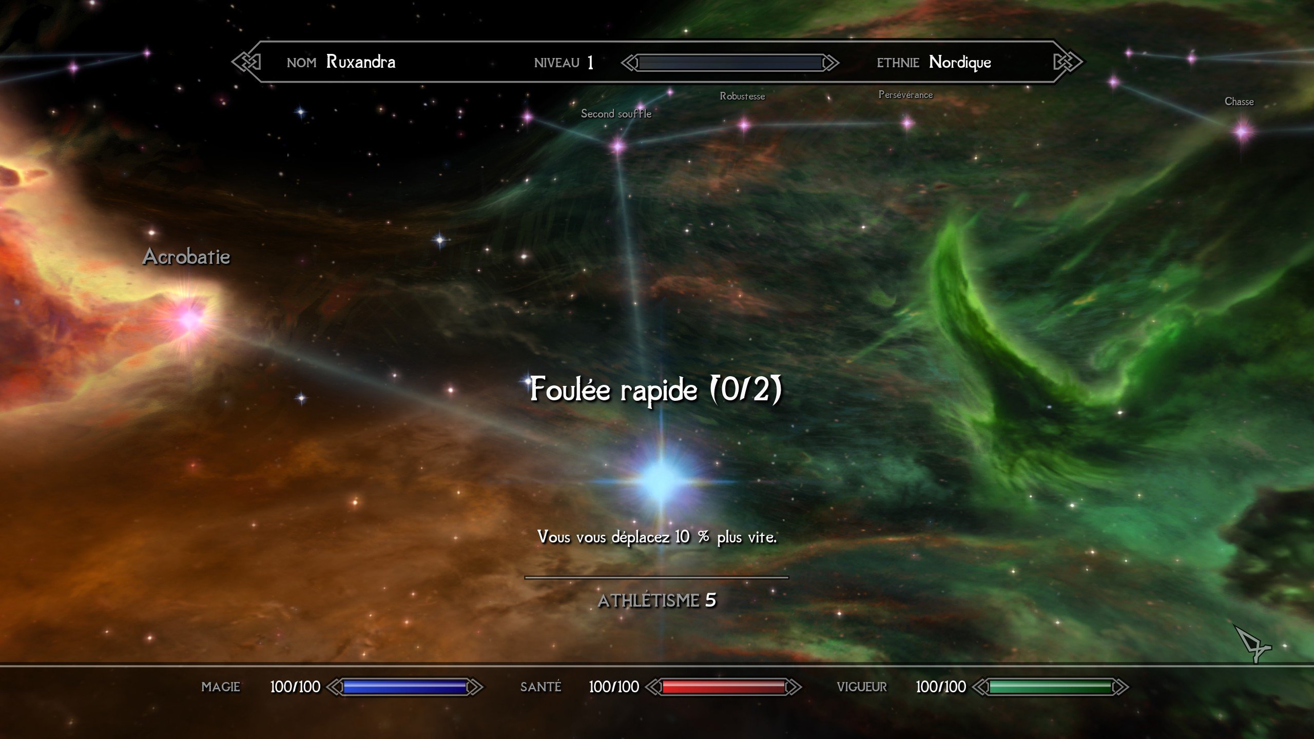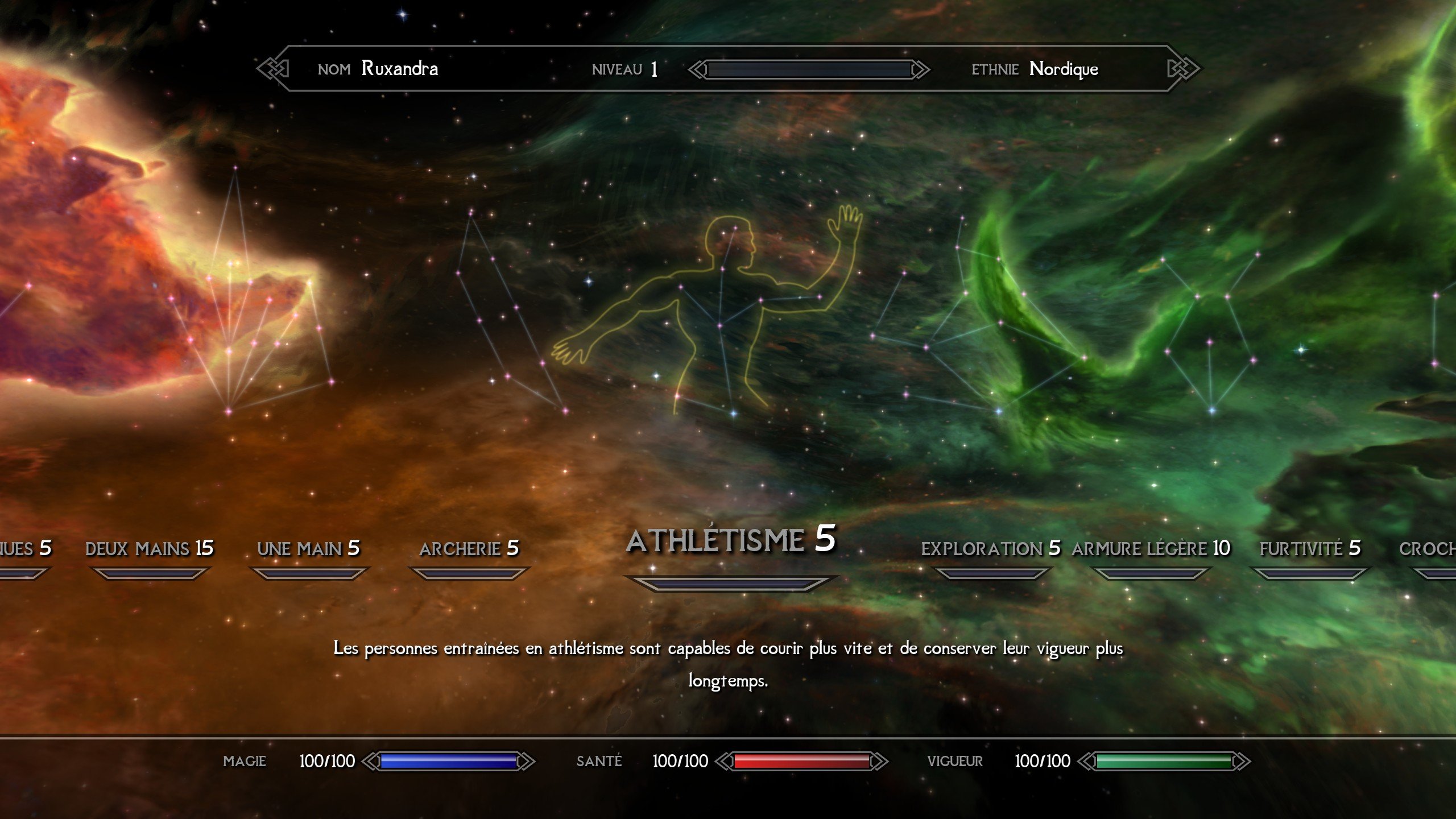 • Athlétisme : régit la vitesse de déplacement, inspirée de Morrowind et d'Oblivion.