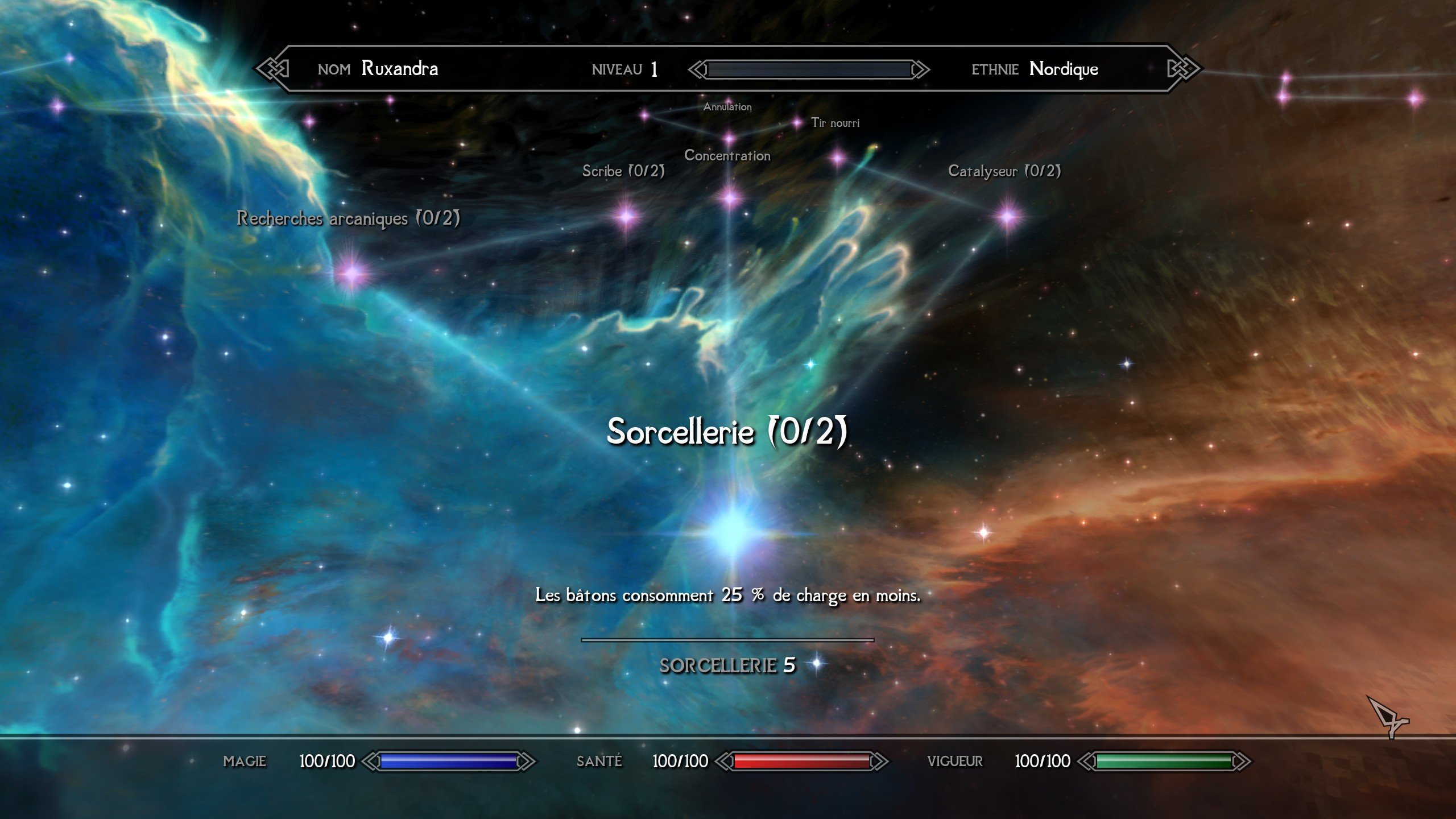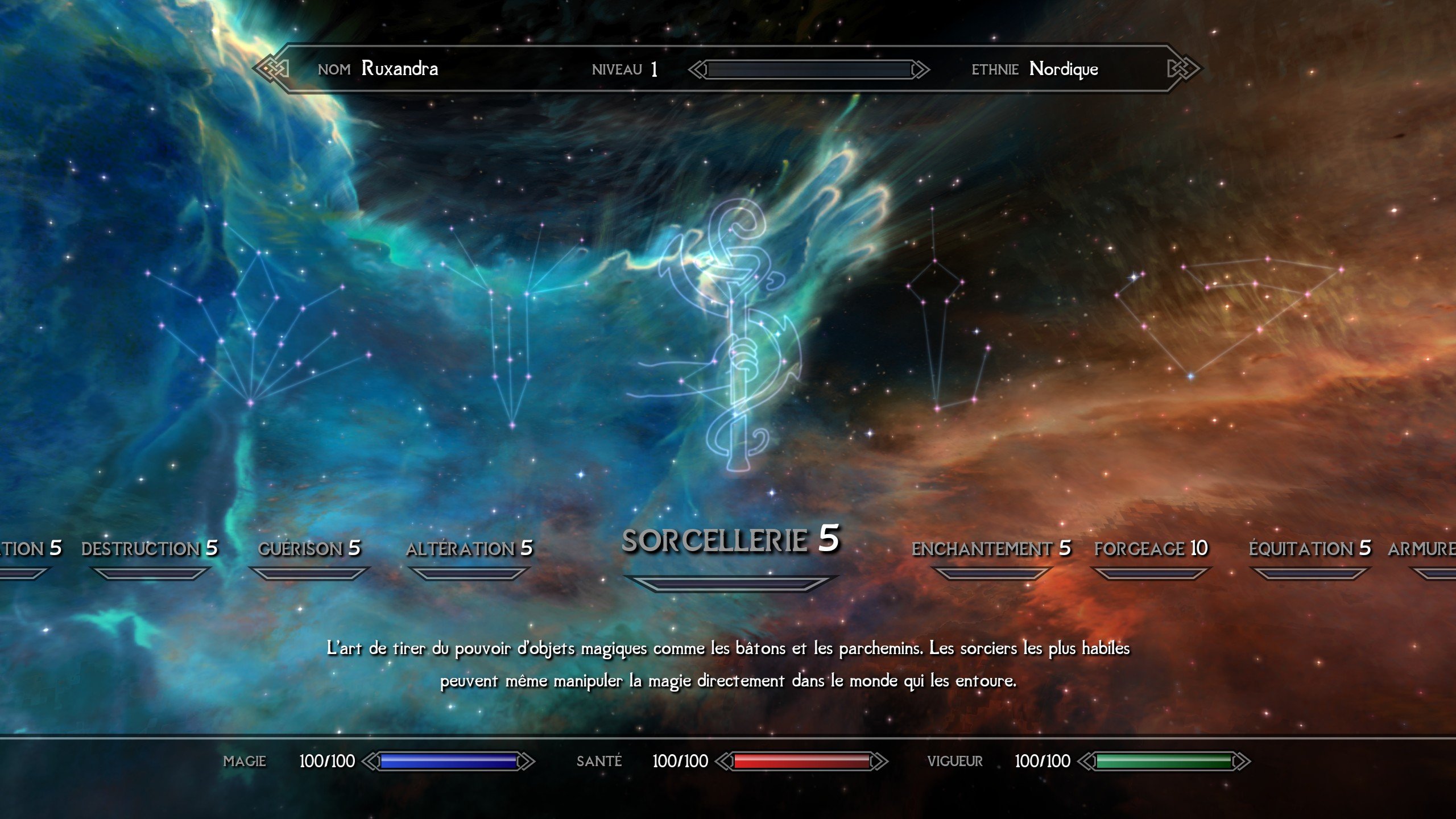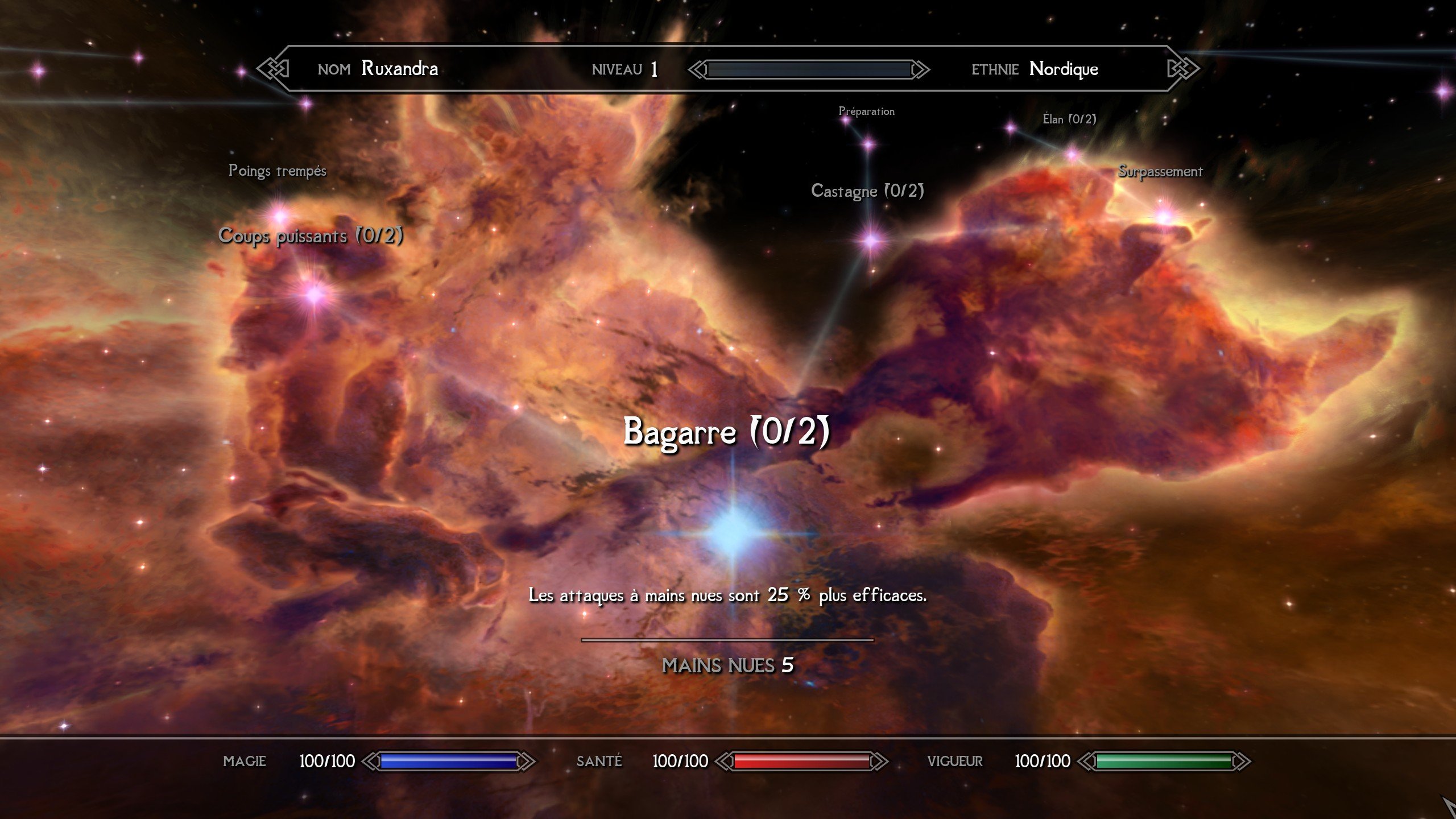 • Athlétisme : régit la vitesse de déplacement, inspirée de Morrowind et d'Oblivion.