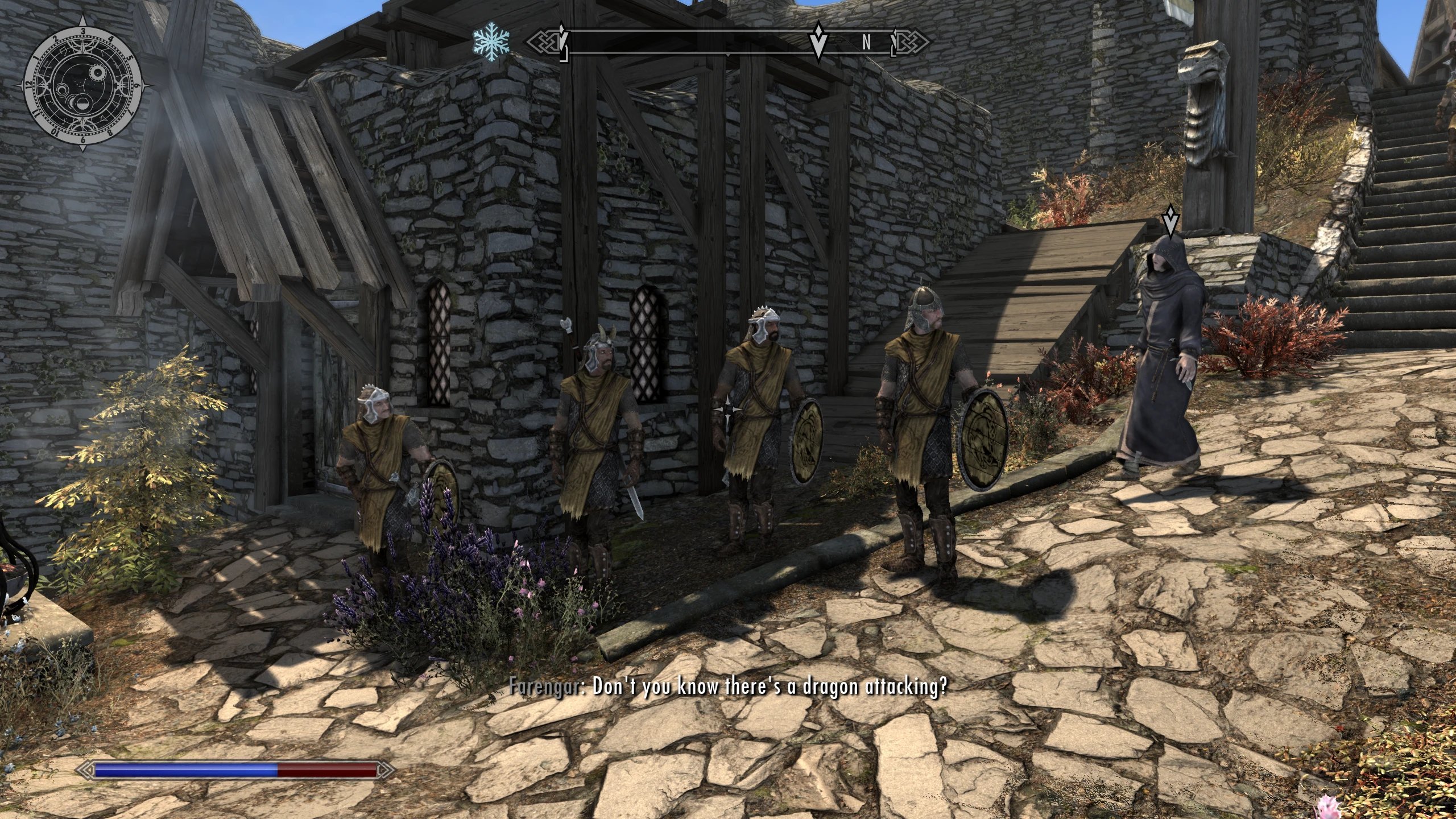 Si Balgruuf a été exilé et que vous n'avez pas terminé « Avant la tempête », le jarl Vignar (ou Hrongar, si vous avez le mod Le dilemme du jarl Balgruuf et son extension) ne vous croira pas lorsque vous lui direz qu'un dragon a détruit Helgen, et vous devrez plutôt vous adresser à Farengar. Une fois « Avant la tempête » terminée, demandez à Farengar : « Vous avez besoin d'aide pour un projet en particulier ? » pour commencer « Le tertre des Chutes tourmentées » et récupérer la Pierre de dragon, ou demandez-lui « Vous avez déjà croisé des dragons ? » pour commencer « L'élévation du dragon ». Les deux quêtes ne peuvent pas être effectuées simultanément, mais une fois l'une terminée, vous pouvez passer à l'autre.