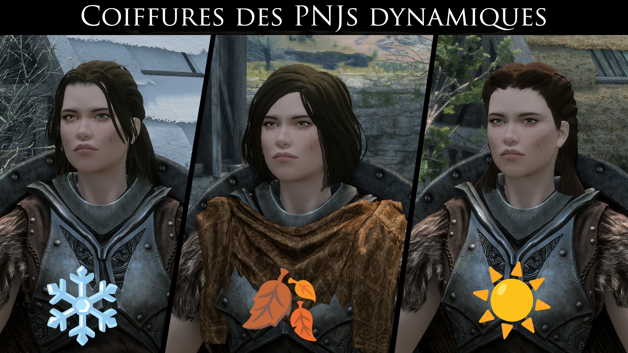 Ce mod permet de changer dynamiquement la coiffure de certains PNJs au fil du temps, au début des saisons. Ces coiffures sont choisies aléatoirement dans une sélection appropriée ; les PNJs chauves ou ceux qui ont une coiffure spécifique (crête, calvitie...) sont exclus. Via le MCM, vous pouvez exclure les PNJs ciblés.