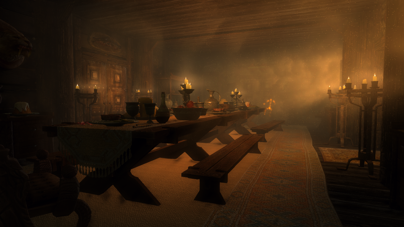 Une capture d'écran de la salle à manger du manoir d'Hérécinde dans la série de mod "Combattre le Thalmor".