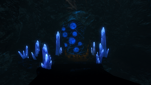 Vous finirez par arriver à une pièce remplie de lave, qui semble sans issue. Comme souvent, c'est une fausse idée, et il vous faudra mettre un noyau d'énergie chargé – trouvable sur les centurions dwemer ou dans la pièce elle-même – sur le générateur. Cela activera les escaliers souterrains qui vous mèneront encore plus profondément sous R'lyend.