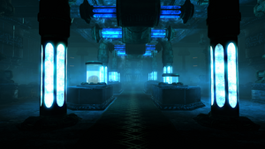 Alors que vous traversez le long couloir – et vainquez les ouvriers élyséens sur votre chemin, vous remarquerez que l'une des capsules est déjà détruite, et que son contenu à disparu. En outre, vous ne pourrez rien faire avec le bouton rouge, alors progressez jusqu'à l'accès sous-marin de R'lyend.