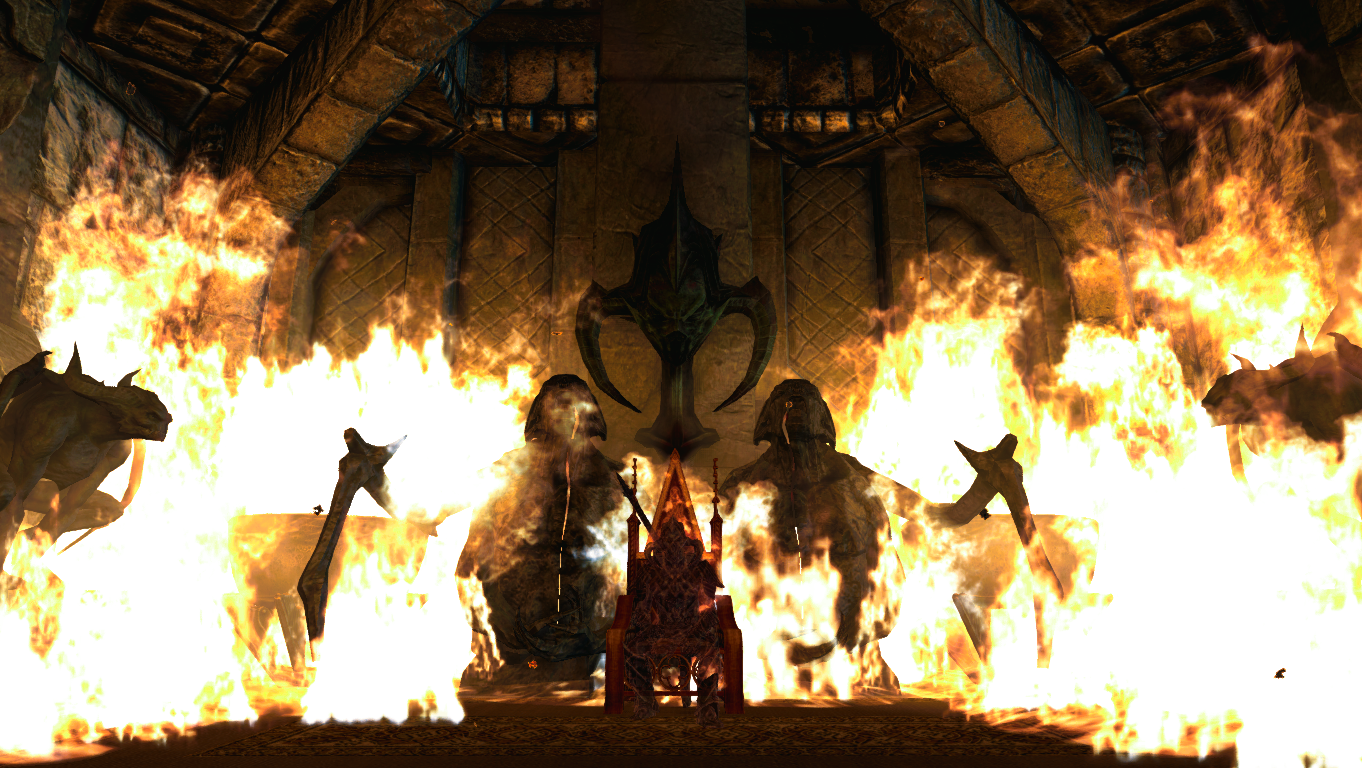Molag Bal, assis sur son trône dans le tombeau de Lamae. Scène de l'Acte II de Vigile.